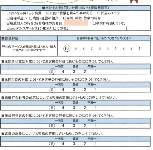 このたびはアンケートにご協力いただき、誠にありがとうございます。担当スタッフへの温かいお言葉まで頂戴し、スタッフ一同大変ありがたく拝見いたしました。これからもご家族様のお気持ちに寄り添いながら、お見送りのお手伝いができますよう努めてまいります。改めまして、このたびは誠にありがとうございました。