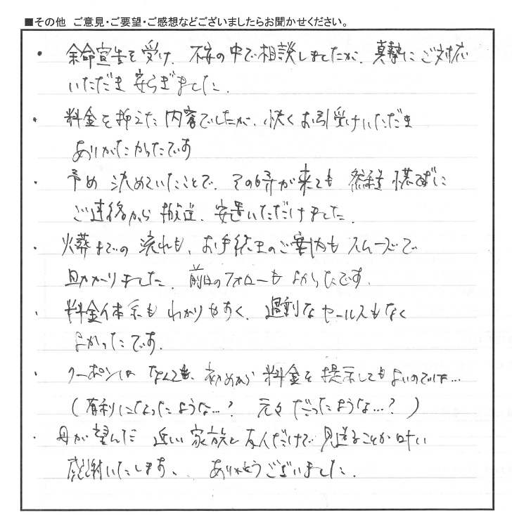 このたびはアンケートにご協力いただき、誠にありがとうございます。初めてのご葬儀でご不安も多かったことと存じますが、少しでもお力添えができておりましたら幸いでございます。大切なお見送りのお手伝いをさせていただけましたこと、スタッフ一同心より感謝申し上げます。改めまして、このたびは誠にありがとうございました。